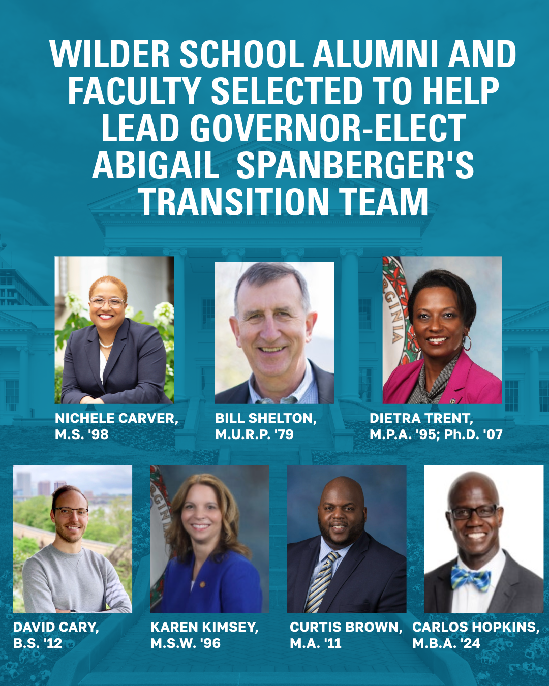 “The Wilder School has long been committed to developing public service leaders who understand the complexities of governing and the importance of serving with integrity. We are tremendously proud to see so many of our alumni and faculty entrusted with shaping the vision and priorities of the next administration. Their appointments reflect not only their individual remarkable achievements but also the strength of the Wilder School community and its enduring commitment to advancing Virginia’s future.”
